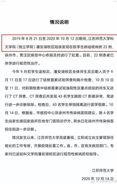 学校是学生高度集中的场所,一旦发生结核病,很容易发生校园内的传播流行。 2020年10月,江苏师范大学科文学院发生校园肺结核疫情。2020年10月14日,该校发布情况说明称,最近一年,陆续发现在校学生肺结核病例22例。近期,该校对师生进行筛查后,发现43名学生胸部CT影像异常。