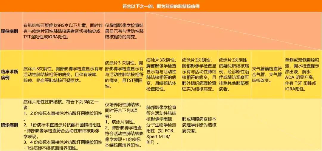 根据病史、影像学和结核菌检查结果可将肺结核患者分为疑似病例、临床诊断病例以及确诊病例。